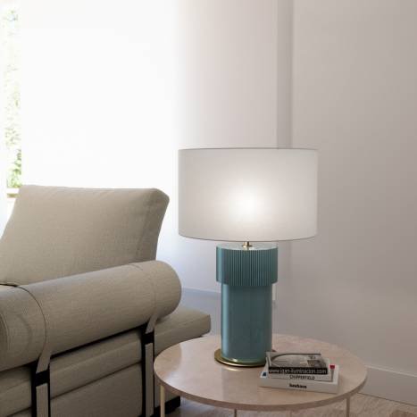 | Material e cor | Metal em cromado Vidro em cor azul méxico NCS S 3010-B10G Cerâmica em cor azul méxico NCS S 3010-B10G Abajur branco em linho claro incluído |