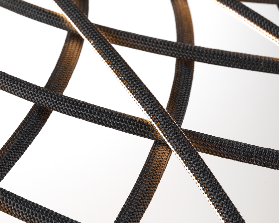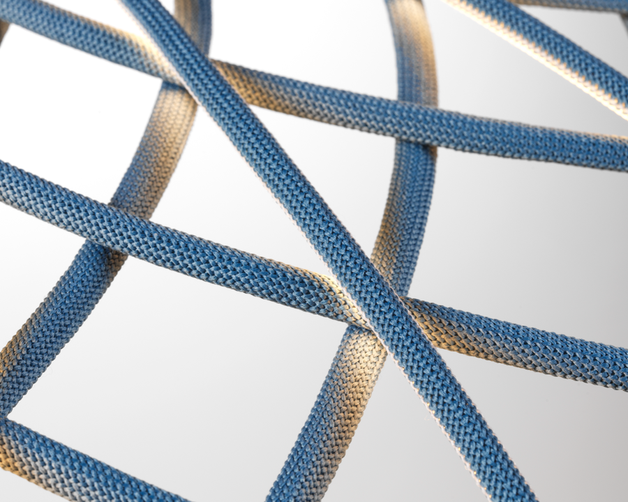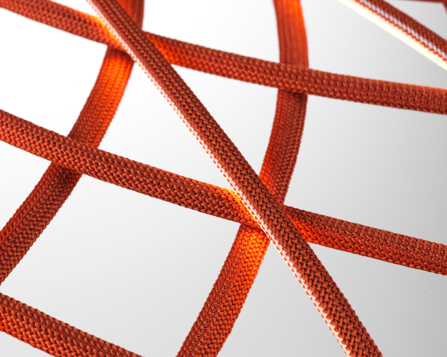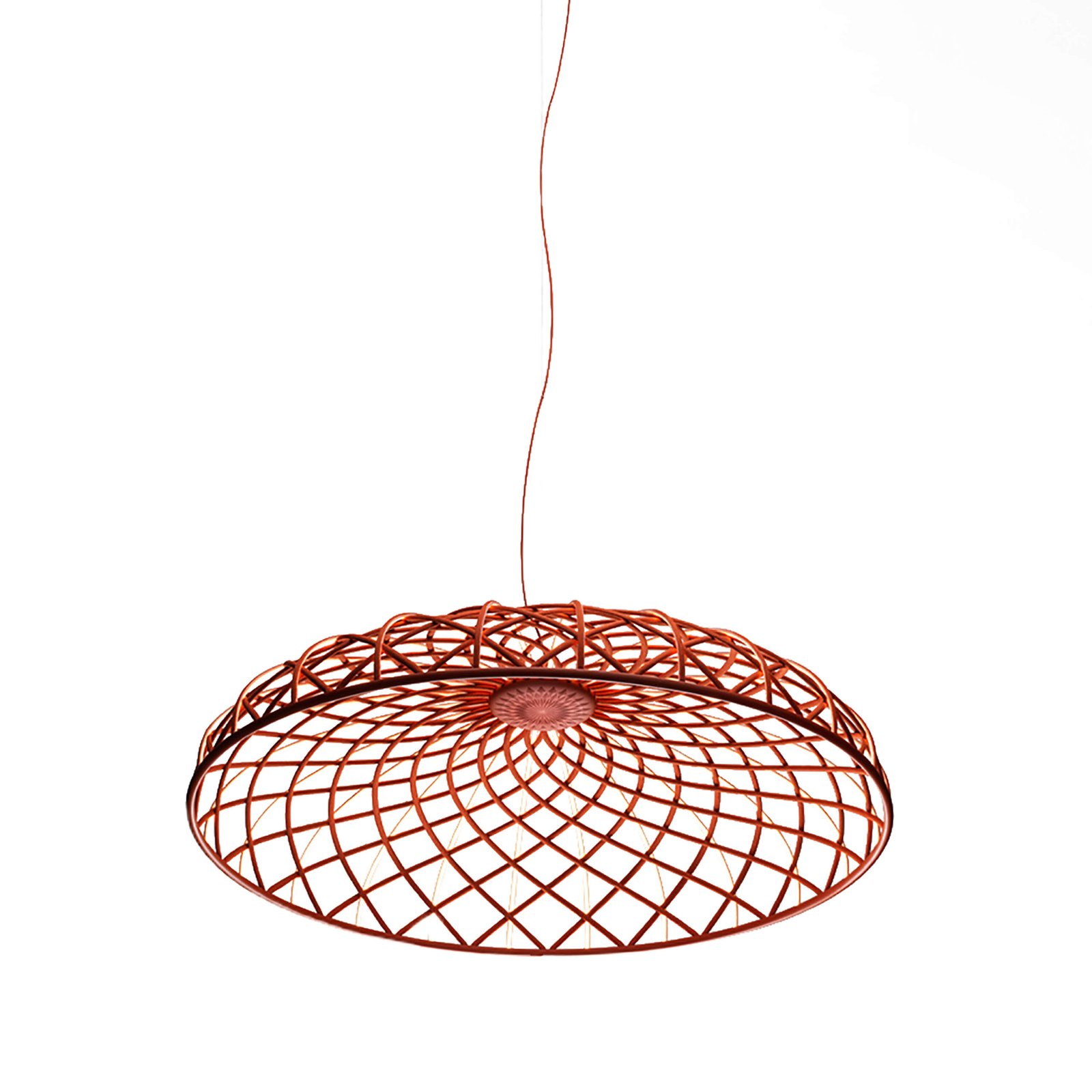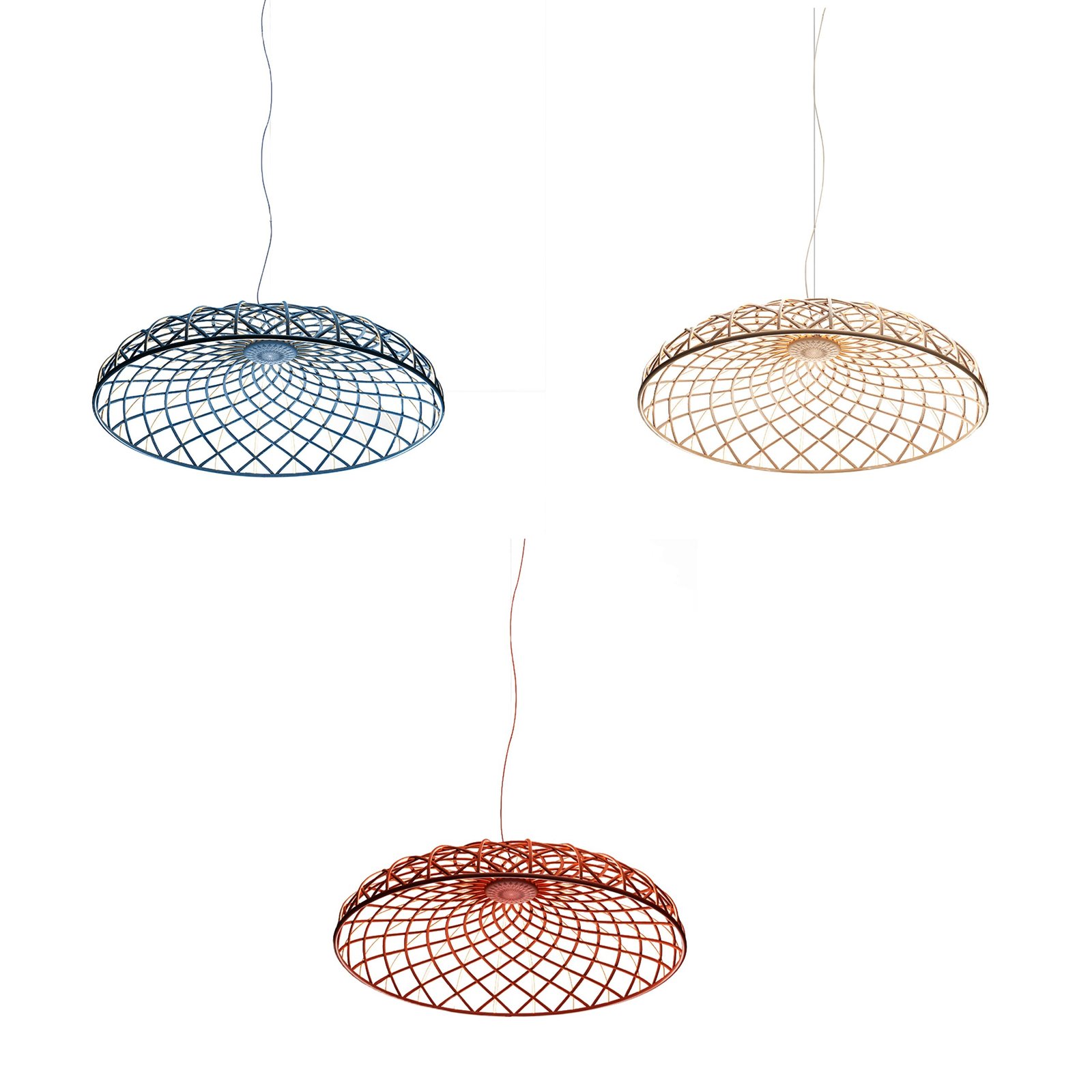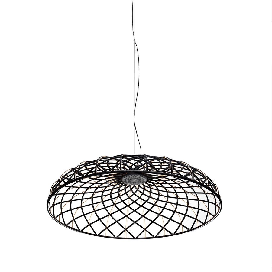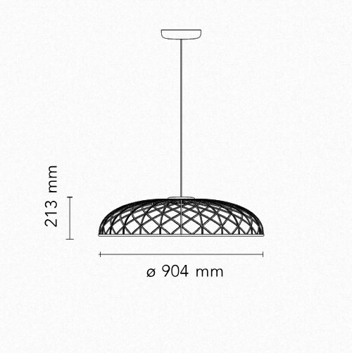 | Material e cor | A cúpula é uma combinação de elementos luminosos e escuros dispostos em rede e formados por estruturas centrais revestidas por uma fina malha tubular colorida entrelaçada, feita de tecido reciclado e reciclável produzido a partir de poliéster. Cada elemento luminoso é alimentado por microconectores especiais localizados na parte superior da cúpula e é revestido por uma malha bicolor, enquanto a face voltada para o interior da cúpula é sempre branca para permitir a emissão ideal de luz do módulo de LED. O aparelho é equipado com um sistema de balanceamento integrado na parte superior da cúpula, que ajuda a ajustar seu equilíbrio, tornando-o perfeitamente estável. A parte inferior da cúpula é completada por um anel de alumínio que mantém toda a estrutura da rede da cúpula no lugar por meio de um sistema simples de encaixe. Acabamentos de luminárias disponíveis: Turmalina Azul, Castanho Amêndoa, Antracite ou Vermelho Tijolo. Rosácea de teto de plástico pintada com o mesmo acabamento da luminária |