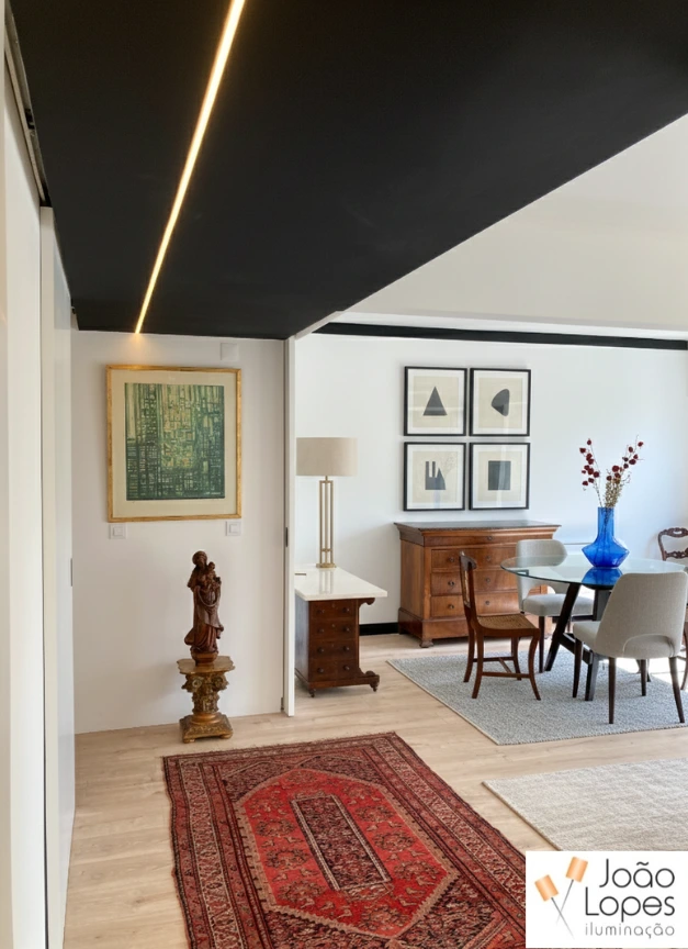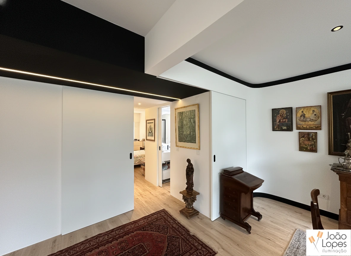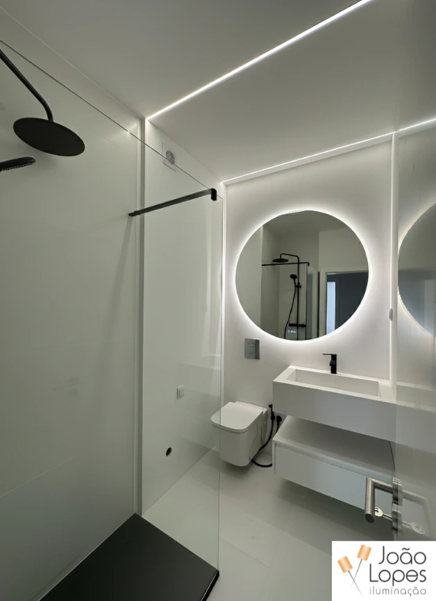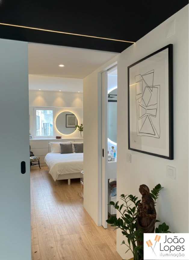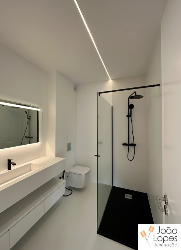 Foram aplicadas linhas de LED integradas no teto, executadas com perfil de embutir branco, permitindo uma integração discreta e contínua nos planos arquitetónicos. Nos interiores, recorreu-se a fita LED COB, garantindo uma linha de luz homogénea e sem pontos visíveis. Nas casas de banho, a solução foi adaptada com fita LED IP65, adequada a ambientes húmidos, mantendo a coerência estética e funcional do projeto.